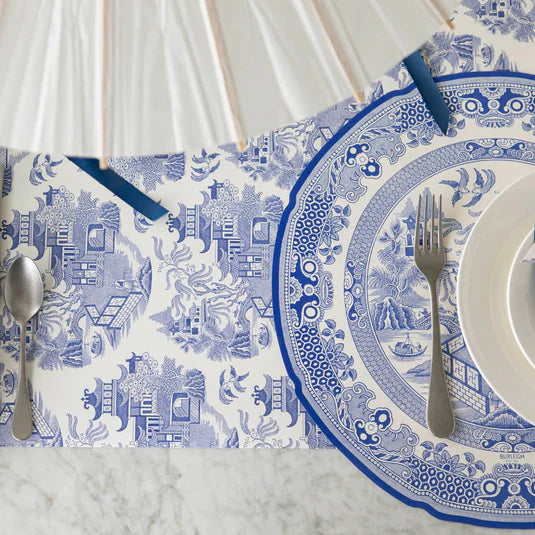 In collaboration with Burleigh, we've brought elements of the classic Blue Willow design to your table as a runner in rich blue tones. This wide width paper toile is reminiscent of a luxurious fabric design. Mix and match between the Blue Willow story, Regal Peacock story and Asiatic Pheasant story to bring our entire Burleigh collection to life on your table.