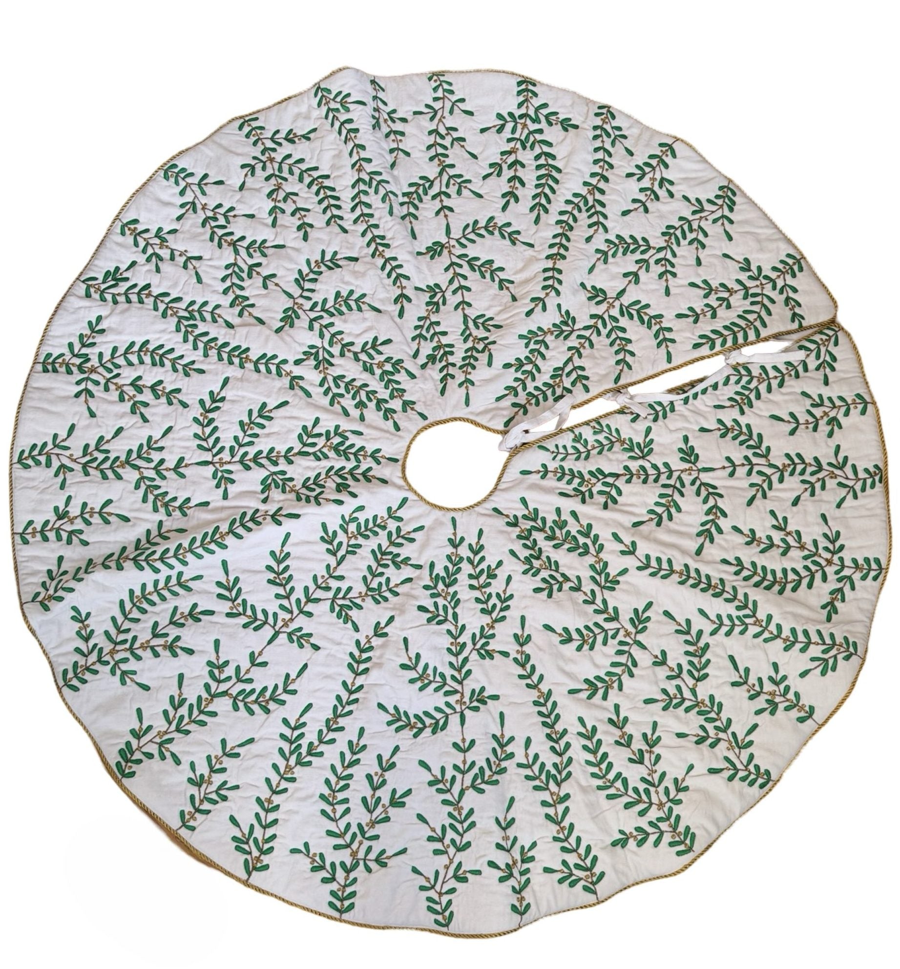 - Festive Hand Embroidered White, Green and Gold Holiday Boxwood Patterned Christmas Tree Skirt