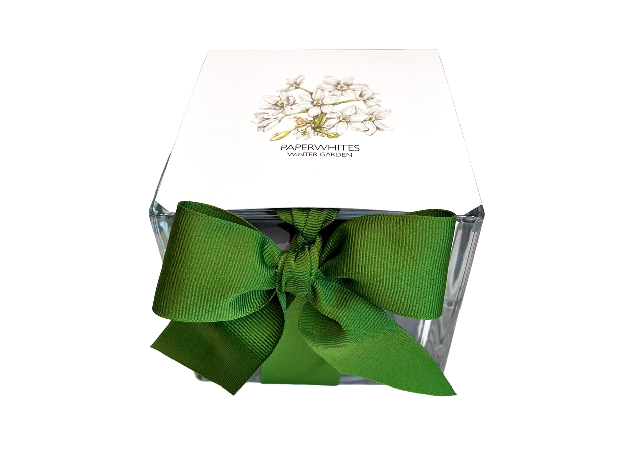 Our Best Selling Paperwhites Winter Garden (Narcissus ziva) Paperwhites are said to be a symbol of hope & new beginnings. These flowers, with petals as thin as paper, are easy to grow and have been given as Holiday and Christmas gifts dating back to the 1700s. includes: cast glass planter with hand-tied grosgrain ribbon, paperwhite bulbs (Narcissus ziva), soil-less growing medium and directions . handmade in Idaho. Plant by 01/31/2026 Once planted, bloom time is 3-5 weeks. Keeping plants cool (around 65 degrees F) will extend bloom time.