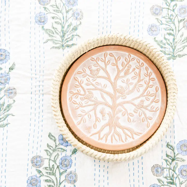This bread warmer basket is the ideal gift for home bakers who love sharing their freshly made loaves with family and friends. Simple to use, it keeps your bread warm throughout dinner! Featuring a charming design with a whitewashed terracotta stone, this sturdy, functional basket also doubles as an attractive fall centerpiece. Perfect for keeping pies, biscuits, tortillas, pumpkin muffins, and all your favorite baked goods warm. Wonderful for year-round entertaining. Size: 3″h x 11″dia Sustainable Materials: Whitewashed terracotta stone and kaisa grass basket. Fair Trade: Women artisans receive a fair, living wage for their work. Use and Care Instructions: Rinse before first use. Dry well. Preheat oven to 350°F. Place terracotta stone in oven and bake for 10 minutes. Do not put basket in oven. Handling carefully, place stone in basket. For best results, wrap food in towel and place on warmer. To clean, rinse with water. Not dishwasher safe.